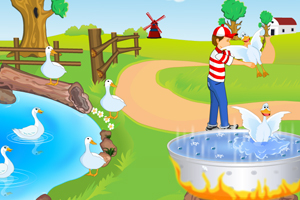 鼠标单击并拖住鸭子,把鸭子从沸水的锅里救出来放到河里或岸边。
