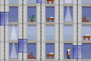 帮助上班族到达他在顶楼的办公室,因为他有电梯恐惧症,只好爬楼梯了,眼看着上班时间到了,晚了就会挨老板骂!这幢大厦每层的楼梯位置都不同,所以他要穿过电梯区域走到楼梯处。@@@方向键→←或ad键行走,s声音,p暂停。