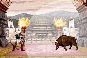 游戏比较简单,但是容量稍大,控制八神或者大门躲开公牛的袭击,还要让上方的长矛刺中公牛,你能完成任务吗?@@@左右键控制方向,上方向键跳跃!