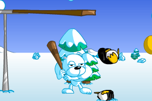 当企鹅走上跳板时,点击画面并拖动鼠标,会出现调整方向和力度的圆圈,鼠标拖动圆圈调整好后,松开鼠标左键挥动球棒...