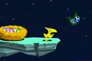 方向键控制移动,找到失散的恐龙蛋并且把它们安全带回窝里,右下角有显示还需要找回蛋的数量,小心空中的蜜蜂和地上的大恐龙捣乱,可以按空格键攻击它们。