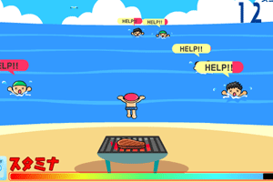 方向键移动救起落水的游客,上岸吃烤架上的食物可以增加体力!