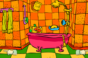 七彩花哨房间系列之花花绿绿的大浴室,大红大绿的多彩卡通风格,呵呵,这游戏里的蚊子可以媲美大力水手了,能拿动钥匙,却害怕一只蜘蛛。