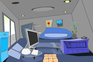 • 鼠标操作点击物品触发事件。1:坐垫移开得到小刀,小刀割开坐垫得到蓝色的钥匙。2:墙上太阳花的画点开得到一把起子。