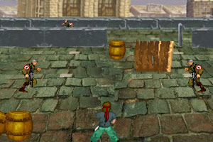 鼠标瞄准射击,S 闪避, A D 左右移动,W 换武器。过关后可购买武器。打死敌人后掉了钱要赶快去吃,否则就消失了。