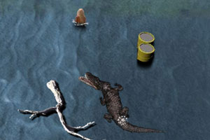 这是一个平静的湖面,可是平静的湖面下却并不平静,一条鳄鱼正在四处游荡寻觅食物。而你的任务就是帮助鳄鱼让它填饱肚子。注意岸上的猎人和水里的汽油桶。