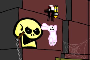 方向键↑↓←→控制蜘蛛超人移动,只要能碰到小白兔就算解救成功。