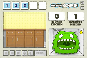 鼠标拖动数字到柜台上,点击运算符号进行运算,使其结果与怪兽想的一样,点击Feed键喂给他。小提示:如果算不出来或运算失败,点击柜台旁的Menu拉出选单,里面有提示和重新开始等。