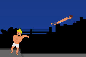 一个很大力的男人正在准备将一个只穿着丁字裤的骨瘦如柴一般的男人扔出去,每一关还有很多不同的道具可以供你来使用。