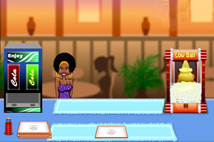 在最繁华的街头开一家属于自己的爆米花小店吧,客流是不用担心的啦,看看你能不能供应的上咯!@@@游戏开始后,发现没有爆米花,点GO TO KITCHEN,右侧的LOW SALT POPCORN,点油拖动到机器里,CORN爆米花原料,最后SAL