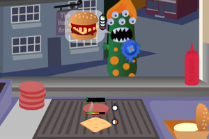 野兽开的汉堡包车,来吃的客人也都是野兽...所以,努力服务好它们吧~@@@鼠标操作,客人来了根据客的人需求制作不同口味的汉堡,首先把起司和肉饼放在架子上烤,然后用铲子,夹起放入烤好的面包片。