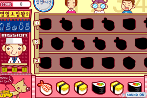 ?转寿司师父配餐,面对不断转动的寿司盘要按客人的需求配上寿司哦!@@@鼠标拖动寿司放在合适的位置。