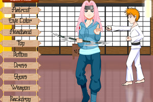火影忍者中的美女们要比武啦!她们在比武前都要精心的打扮并挑选自己最精通的武器喔~@@@鼠标操作,点击更换饰品栏的箭头。