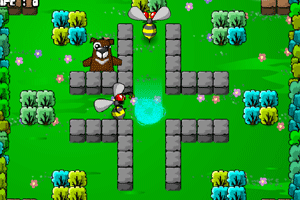 空格攻击树木,出现果子吃掉,键盘方向键移动。要躲开蜜蜂...