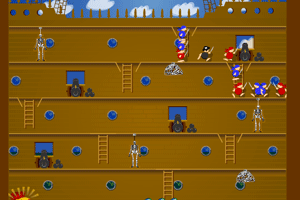你要让他们下来越过有机关的门,同时也不让他们掉进陷阱死掉,最后还要取到财宝.开始玩还真有一定的难度,熟悉就好多了,用鼠标点击楼梯边上有一道机关可以下来,但是下来的人员不能碰到机关,不然就game over了,要看仔细哦,闯到最后才可以拿到财宝,对死伤人员有限制哦.