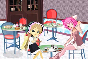 两个美女在一家阁楼茶餐厅喝茶这里的布局挺精致的,试着来布置下这家茶餐厅吧!@@@鼠标操作,拖动物体、人物到相应的位置。