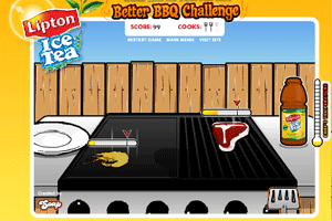 立顿公司出的烧烤游戏,挺可爱的,画面很精美!烤肉香都能引来调皮的邻居小孩哦!~@@@肉放在烤炉上面,会有一个进度条,当进度条到三角箭头那里就说明那一面烤好了,要换面,两边都换过后就烤好了!烤肉的时候很热,你还需要补充水分就要和立顿冰红茶,呵