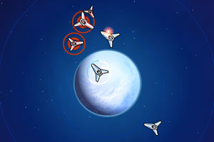太空国防舰队游戏,主要任务是防御外星人的袭击,一定要保证星球的安全,并摧毁敌人的侵略计划!@@@鼠标选中战斗机后单击其它地方移动战斗机,选中战斗机后点击入侵敌机可以对其进行攻击,并且还可以将几架战斗机一起选中攻击敌人。