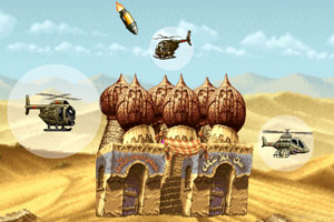 这个画面近似《合金弹头》的游戏但并不是一个横板过关游戏,而是控制三架直升机,通过拖拽移动挡住四方八面射来的飞弹,以守卫城堡。希望大家喜欢!@@@鼠标拖动直升机到飞弹位置。