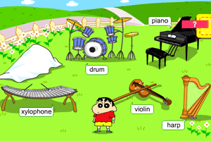 乐器单词练习1,和小新一起来练习吧!@@@鼠标单击操作。