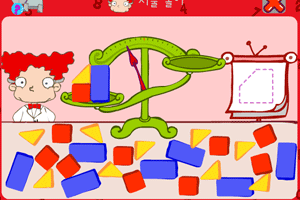 按照天平左边给出的不同颜色的积木放到右边的托盘里使天平达到平衡。